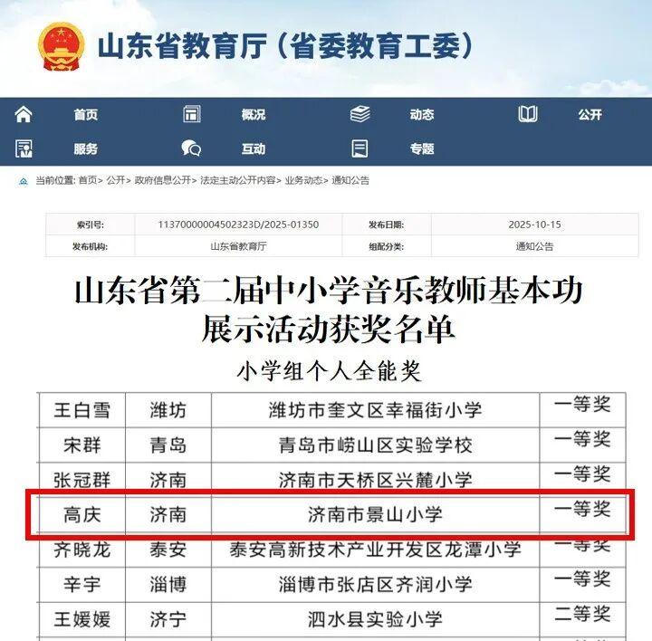 鲁网10月23日讯近日,山东省教育厅公布山东省第二届中小学音乐教师基本功展示活动获奖名单 ,济南市景山小学高庆老师荣获个人全能一等奖。